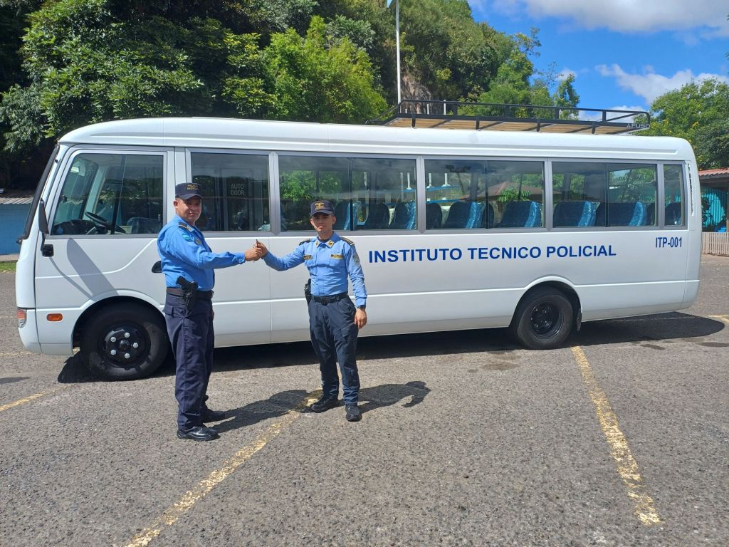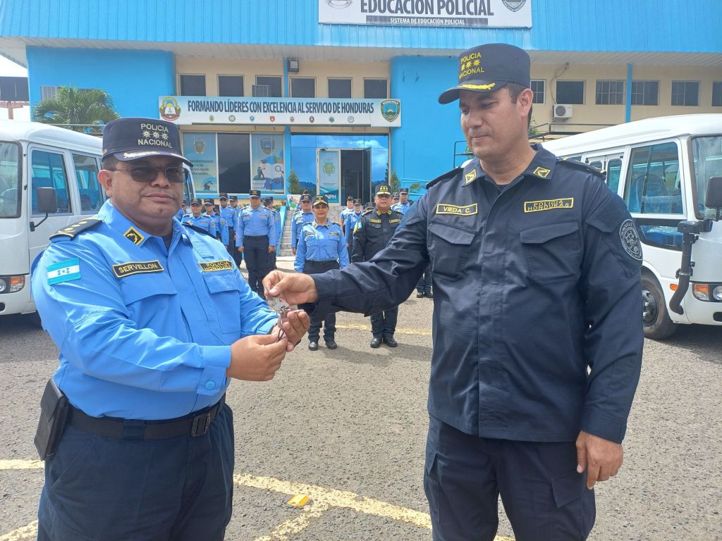 Los buses fueron entregados por el señor Subdirector de Logistica de la Policía Nacional, Comisionado de Policía, Marvin Geovanny Vieda Carrasco y recibidos por el señor Rector de la UNPH, Comisionado de Policía, José Reinaldo Servellón Castillo.